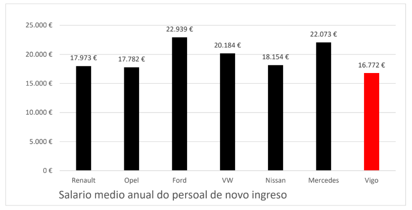 Mientras el salario de un operario de nuevo ingreso de Mercedes se encuentra por encima de los 22.000 euros anuales, los de Vigo se quedan en unos 16.772 euros, más de mil euros por debajo de los operarios de marcas de Renault u Opel, con sueldos superiores a los 1.780 euros. “El salario de entrada de Stellantis Vigo está por debajo del salario provincial del metal de Pontevedra”, lamenta el organismo sindical, haciendo referencia al convenio de referencia tras la reforma laboral.