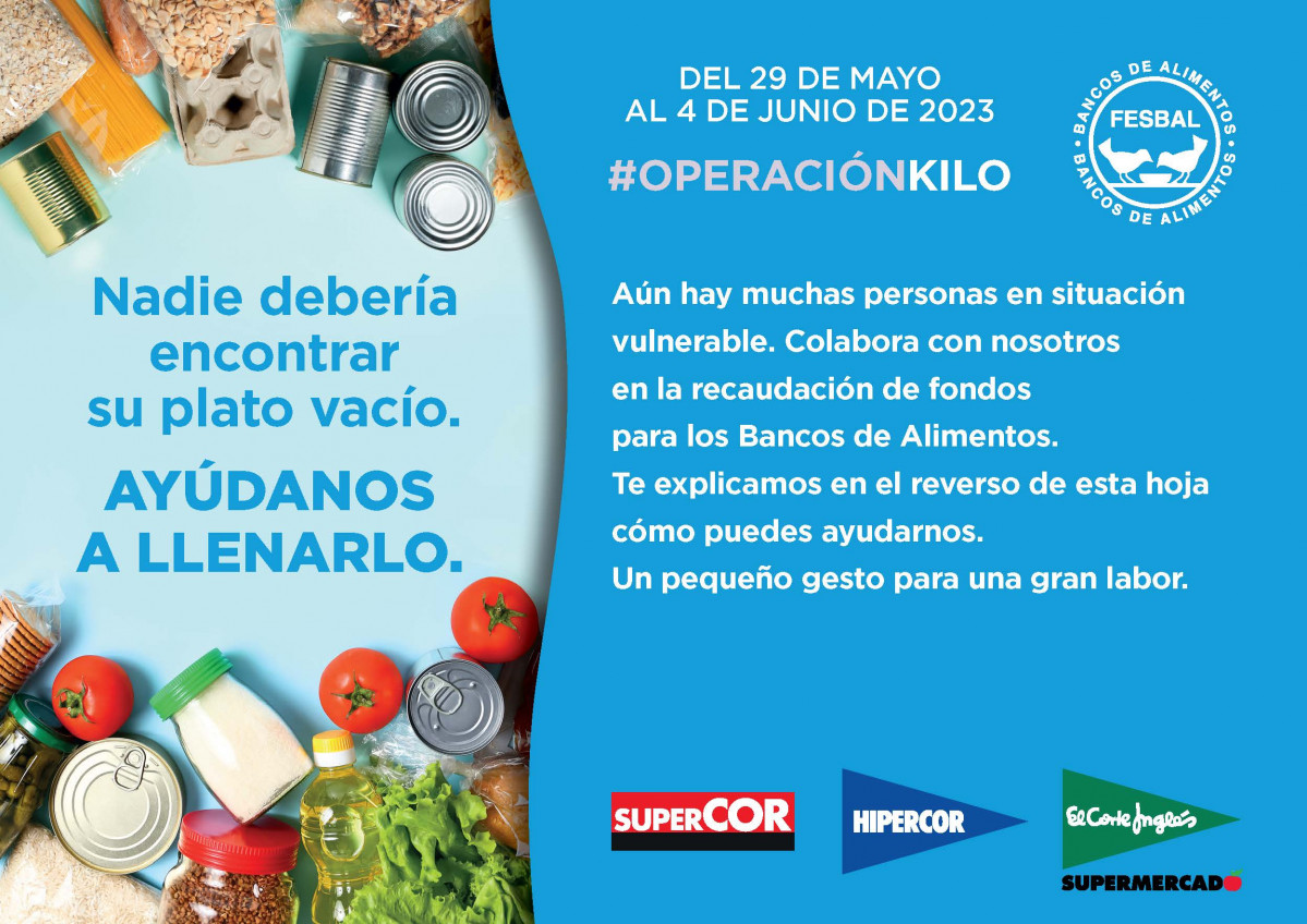 A pocos días de que empiece el veranito empieza la Operación más importante de todas. No es la Operación Bikini, es la 'Operación Kilo' de Bancos de Alimentos, en la que colaboran todos los establecimientos de El Corte Inglés. De esta forma, los establecimientos de alimentación de la cadena, así como Hipercor, Supercor, Supercor Express y Sánchez Romero colaboran en esta campaña que arranca este lunes 29 de mayo.