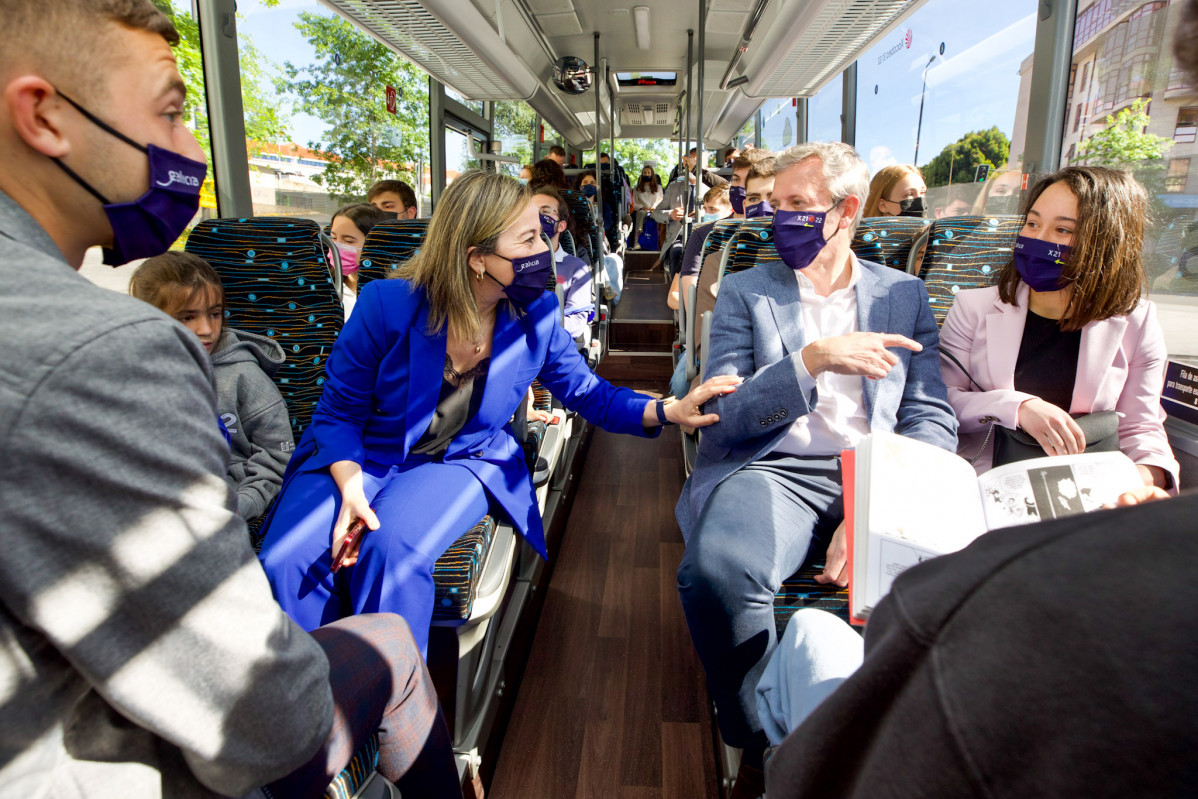 El presidente de la Xunta, Alfonso Rueda, y la conselleira de Transporte, Ethel Vázquez, en un autobús | Foto: Xunta.gal