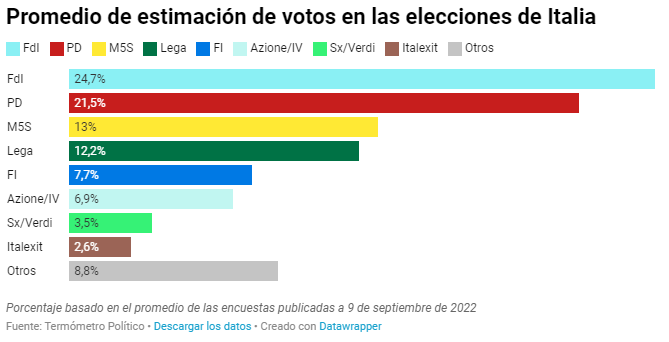 En Italia, a diferencia de España, no está permitida la publicación de encuestas durante las dos semanas previas a las elecciones. Por lo tanto, según el promedio de las encuestas recogidas por el proyecto demoscópico italiano Termómetro Político, la derecha de FdI sería la fuerza más votada, con un 24,7% de los votos, frente al 21,5% que obtendría el PD. En tercer lugar estaría el M5S, que conseguiría un resultado de un 13%, seguido de la Liga, que alcanzaría un 12,2%, y Forza Italia, que seduciría al 7,7% del electorado. Azione-Italia Viva sería la quinta formación con más apoyo, al hacerse con un 6,9%, mientras que Los Verdes conseguirían un 3,5%