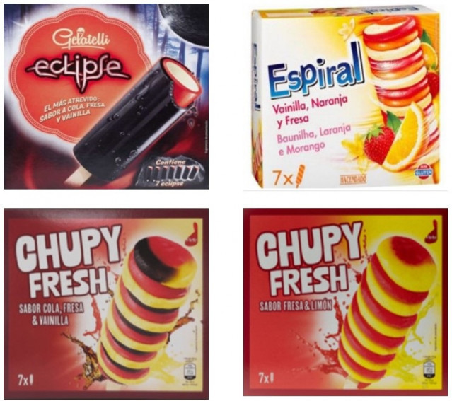 En concreto, los productos afectados son Gelatelli 7x75 Eclipse de Lidl, Espiral 7x75 de Hacendado, y Chupy Fresh y Chupy Cola de Aldi.