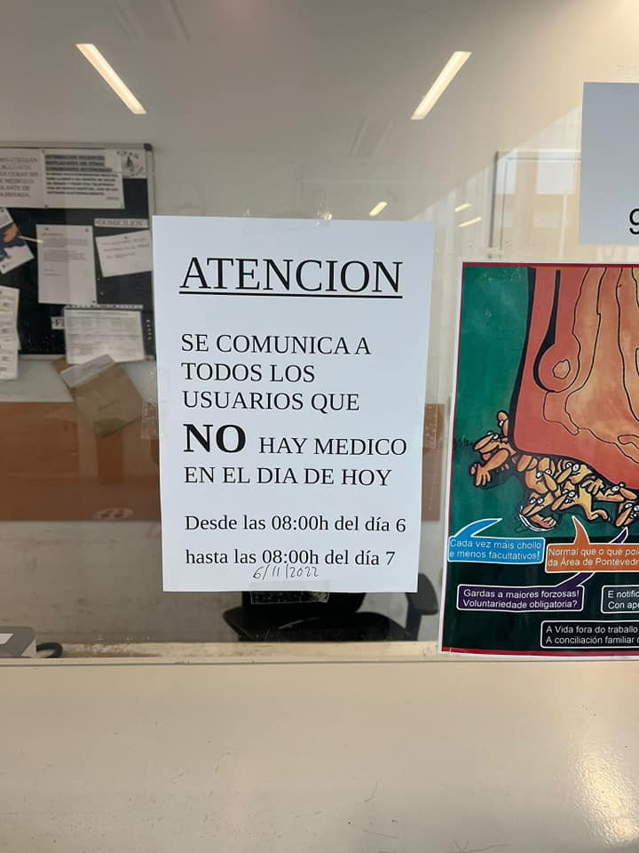 También en redes sociales abundan los testimonios recientes de problemas. Por ejemplo, pacientes de Marín tuvieron que ir a las urgencias de Bueu porque las suyas estaban sin médico este fin de semana ese fin de semana o el consultorio médico de A Parda estuvo sin médico de urgencias a principios de semana.