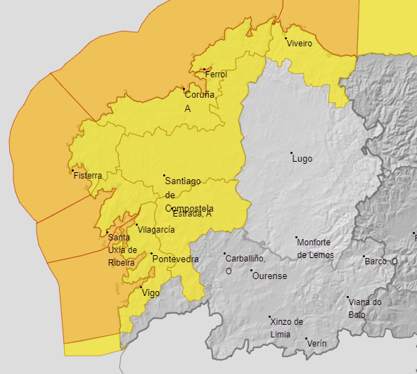Para el jueves, la AEMET tiene vigentes alertas por lluvias, viento y mar de fondo en toda la provincia de A Coruña, casi toda la de Pontevedra (salvo el Valmiñor) y A Mariña de Lugo.