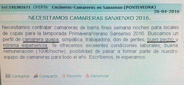 El anuncio ya ha desaparecido de la conocida web de anuncios milanuncios.com. Pero sigue circulando en las redes sociales. El él se buscaba a una camarera de barra “con buen pecho y mínima experiencia” para un pub de Sanxenxo.