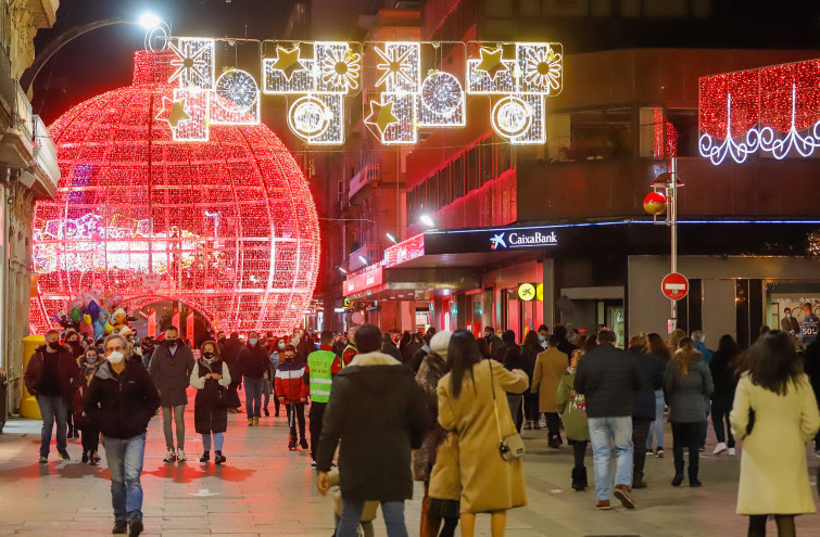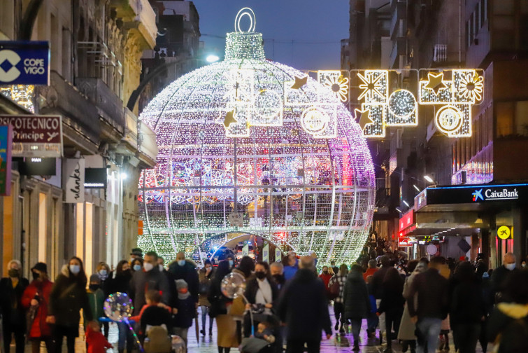 El acto en el que se enciende el alumbrado navideño de Vigo atrae a miles de curiosos a la Porta do Sol, donde habrá un dispositivo especial este sábado y limitará el aforo.