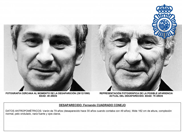 El Cuerpo Nacional de Policía ha solicitado colaboración ciudadana y ha difundido un retrato de envejecimiento para encontrar al doctor Fernando Cuadrado Conejo, desaparecido hace casi 30 años en A Coruña.