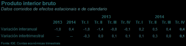 El PIB gallego encadena ya 4 trimestres consecutivos con tasas interanuales positivas, y en el cuarto trimestre de 2014 la tasa intertrimestral también fue positiva (0,1%).