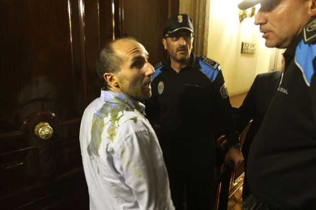 Pérez Jácome abandonó el consistorio acompañado por el también edil, y médico, Miguel Abad, del PP, para acudir a un centro médico, mientras alcalde y portavoces acordaron de forma unánime suspender la sesión plenaria del mes de abril y aplazar los debates pendientes hasta la próxima semana, además de expresar su "enérgica repulsa contra cualquier tipo de manifestación violenta, en cualquier ámbito".
