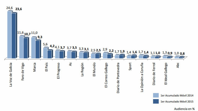 O estudo Xeral de Medios (EXM) publicou os primeiros datos de consumo de medios en 2015 e a consultora Avante fixo un desglose para os medios galegos que constata unha caída xeneralizada da prensa e a subida doutro tipo de medios. En concreto, os medios en papel caeron nestes primeiros meses de 2015 de xeito notable (os diarios, máis dun 7%, as revistas un 2,75% e os suplementos perden un 14%. Os únicos medios que suben (e non demasiado) son a televisión, Internet, exterior e o cine.