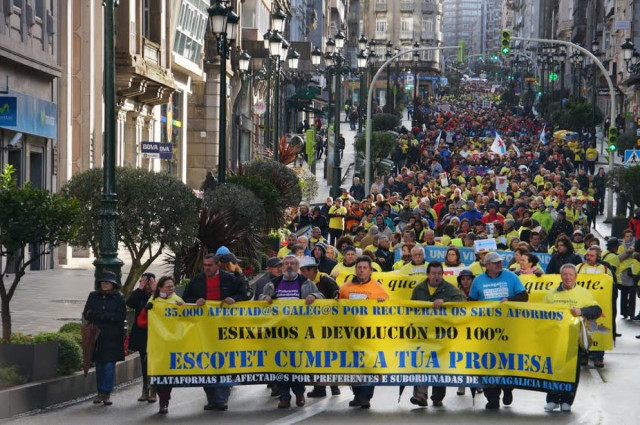 O informe do FROB de 2014 cifrou en 116.000 o total de afectados por preferentes e subordinadas en Galicia, cunha estafa cifrada en máis de 1.800 millóns de euros. Nos últimos anos, os afectados en Galicia saíron á rúa e manifestáronse en numerosas ocasións e a coordinadora das plataformas advertiu que aínda quedan unhas 10.000 familias sen os seus aforros, que suman uns 200 millóns de euros. A Eurocámara comprometeuse esta mesma semana a continuar coa investigación para determinar se o Estado español incumpriu normativas comunitarias ao vender estes produtos complexos.
