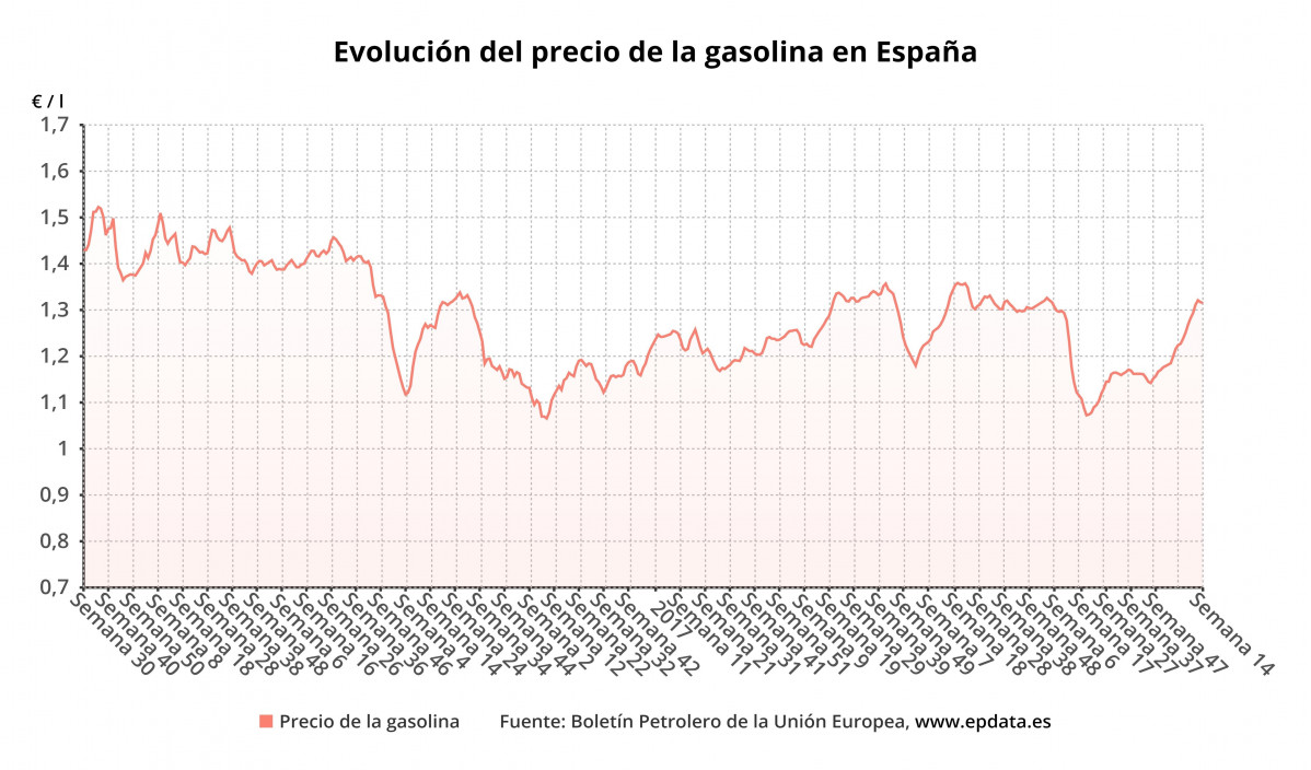 Evolución del precio de la gasolina 95 en España hasta la semana 14 de 2021 (Boletín petrolero de la UE)