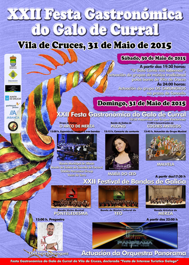 Van 22 edicións da Festa Gastronómica do fachendoso "Galo de Curral" -declarada de Interese Turístico Galego- prevista para o domingo 31 de maio, sen descoidar o sábado 30, ámbos teñen un programa denso e atraínte cunha oferta tamén marcada por propostas musicais de relevancia internacional.