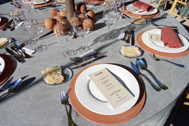 La velada ha finalizado con una cena, cuya decoración contó también con la superficie ultracompacta Dekton® by Cosentino. Dos propuestas de color que verán la luz próximamente, bajo la serie Craftizen, daban forma al circular bajoplato y la minuta sobre la que se imprimió el menú a degustar.