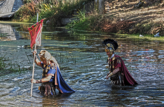 Un soldado y un centurión romano cruzando hoy el río Lethes en Xinzo de Limia (Ourense), durante la Festa