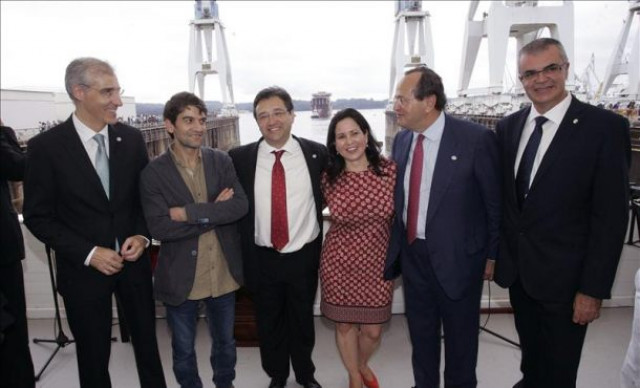 (izda a dcha) El conselleiro de Economía, Francisco Conde, el alcalde de Ferrol, Jorge Suárez, el presidente de PMI, filial de Pemex, José Manuel Carrera, la "madrina" de la embarcación, Victoria Eugenia Aguiar, el presidente de Navantia, José Manuel Revuelta, y el delegado del Gobierno en Galicia, Santiago Villanueva en un momento del acto de la botadura del buque "Orgullo Petrolero", en Ferrol