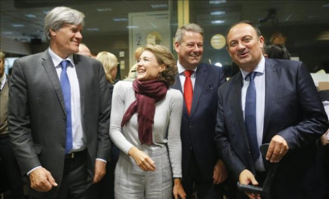 A ministra de Agricultura, Alimentación y Medio Ambiente, Isabel García Tejerina, o seu homólogo francés Stephane Le Foll (izda), o austriaco Andra Rupprechter (2d), e o belga Willy Borsus conversan durante o Consello extraordinario de ministros de Agricultura da Unión Europea (UE) pra debatir solucions a actual crisis agroalimentaria do pasado 7 de septembro