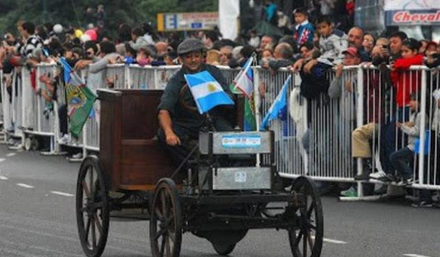 Réplica do coche fabricado por Iglesias, desfilando polo Paseo do Bicentenario, en Bos Aires.
