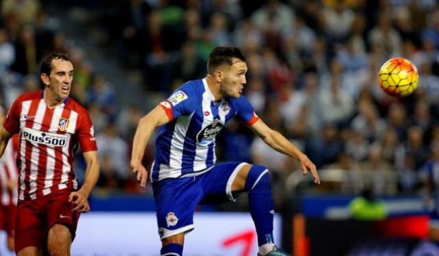 El delantero del Deportivo Lucas Pérez, con el balón ante el defensa del Atlético Diego Godín