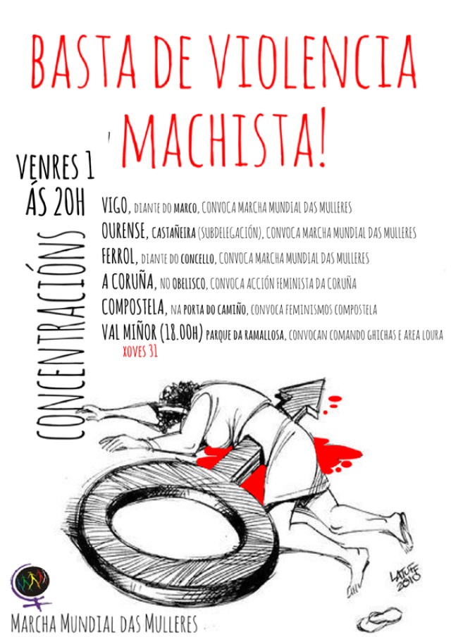Las principales ciudades gallegas acogerán este viernes 1 de enero varias concentraciones en repulsa de la violencia machista y bajo el lema 'Basta de violencia machista', según ha indicado la Marcha Mundial das Mulleres en su página de Facebook.