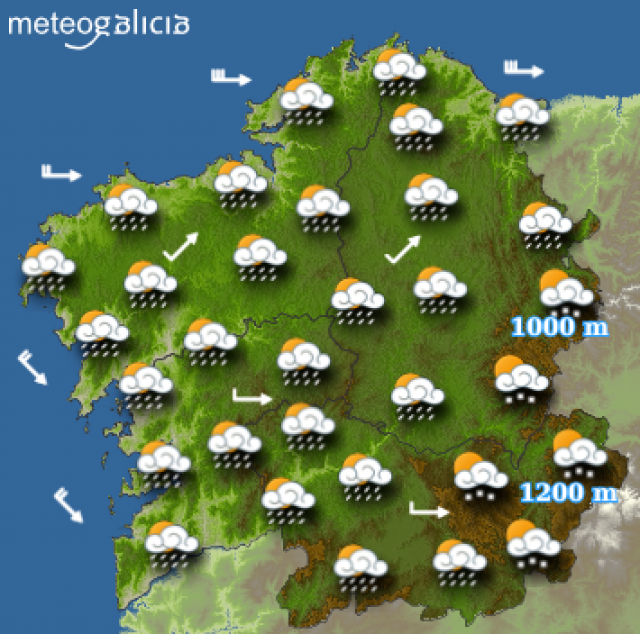 A cota de neve estará sobre os 1000-1200 metros. As temperaturas mínimas sufriron un lixeiro descenso, mentres que as máximas continuarán sen cambios. Os ventos soprarán de compoñente oeste, frouxos no interior, moderados na costa, con intervalos fortes pola mañá no litoral norte.