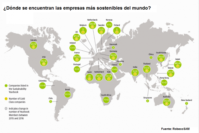 España, que mantén 20 empresas no ránking, igual que en 2015, é o oitavo país con máis compañías presentes no Anuario da Sustentabilidade 2016 de RobecoSAM, só por detrás de Estados Unidos (75), Reino Unido (47), Xapón (48), Corea do Sur (39) Francia (36), Alemaña (26) e Australia (23).