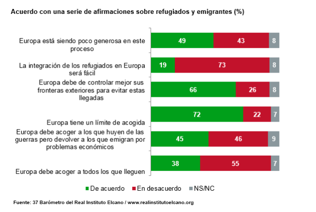 Só un 38 por cento defende que Europa acolla a todos os que cheguen, fronte a un 72 por cento que afirma que Europa ten un límite de acollida. Existe división de opinións con respecto a se a UE está a ser pouco xenerosa neste aspecto. Cinco de cada dez españois así o cre, fronte a un 43 por cento que considera que a UE si está a ser xenerosa cos refuxiados.
