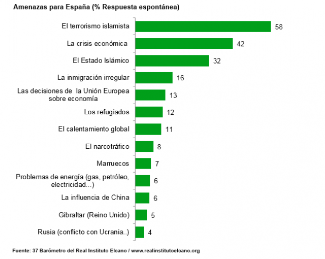 O 58% dos enquisados sinalan o terrorismo yihadista como o seu maior temor. Entre as principais ameazas do exterior, os españois engaden tamén a crise económica (42%), a inmigración irregular (16%), as decisións da Unión Europea (UE) sobre economía (13%), os refuxiados (12%), o quecemento global (11%), o narcotráfico (8%), Marrocos (7%), problemas de enerxía (6%), a influencia de China (6%), Xibraltar (5%) e Rusia (4%).