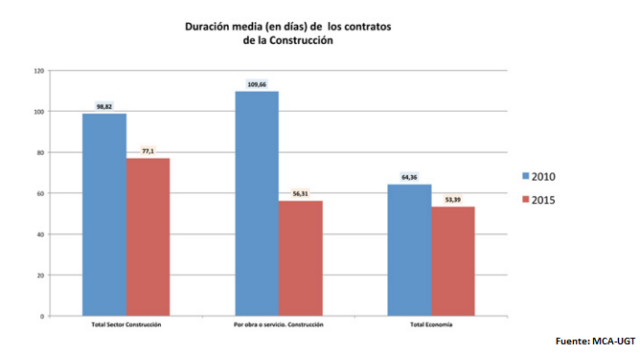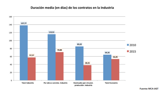 En base aos datos do Ministerio de Empleo, MCA-UGT indica que a duración media destes contratos é de 57,7 días, fronte aos 137,7 días que tiñan de media en 2010. Ademais, o sindicato especifica que a metade dos contratos realizados na industria en 2015 duraron pouco máis dun mes (38,3 días).