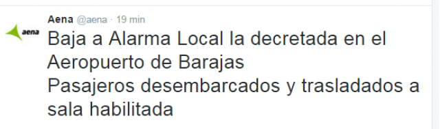 El aeropuerto Adolfo Suárez Madrid-Barajas acaba de rebajar a nivel local la alarma general que había activado tras recibir una comunicación del comandante de un vuelo de Saudian Arabian Airlines, que debía salir hacia Riad a las 10.30, informando de una amenaza a bordo.