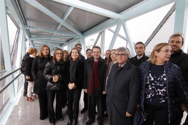 Ana Pastor y Abel Caballero, junto al resto de autoridades, este viernes en la nueva pasarela que conecta el aeropuerto de Peinador y el Instituto Ferial de Vigo (Ifevi). (Foto: M. Fomento)