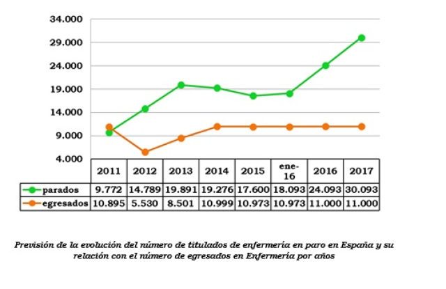 Ante la falta de empleo existente desde el sindicato consideran que por el momento es "totalmente ilógico" que se siga incrementando de la manera en que se está haciendo el número de enfermeros egresados cada año, apuntando que, a tenor de la evolución normal del paro enfermero en relación con el número de nuevos titulados, se puede llegar a contar a finales de 2017 con una tasa de desempleo superior al 15 por ciento.