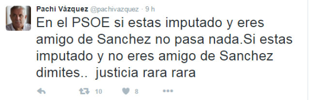 No es la primera vez que Pachi Vázquez se muestra crítico con su propio partido a través. Este mismo miércoles cuestionó las negociaciones del PSOE con Ciudadanos: "No sé si es cosa mía... pero tengo la sensación de que nuestro PSOE se está inclinando hacia la derecha.. ojalá que no".