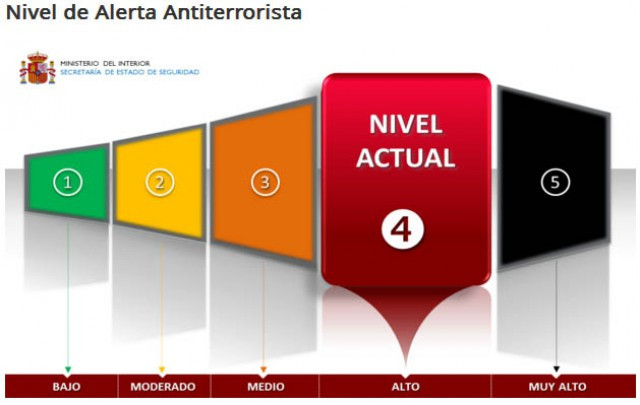 En España la alerta antiterrorista permanece en nivel alto tras los atentados de Bruselas. En concreto, el ministerio del interior ha decidido mantenerla en un nivel 4, de una escala total de 5.