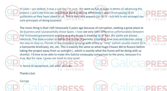 Las acusaciones más contundentes proceden de un correo electrónico enviado el 12 de noviembre de 2014 por el presidente de Edgewater, George Salamis, a uno de los directivos al frente del proyecto gallego, Lluis Boixet. Este correo se integra en la demanda, aportado como prueba de la mala imagen que se llevaron los directivos de la compañía y sus inversores asociados de la actuación de la Xunta de Galicia.