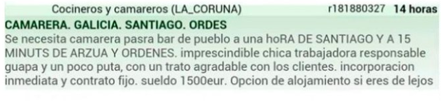 No es la primera vez que en esta página de anuncios se publican ofertas de trabajo con contenido sexista. En febrero de este año, un local de Santiago de Compostela buscaba una camarera “guapa y un poco puta”.