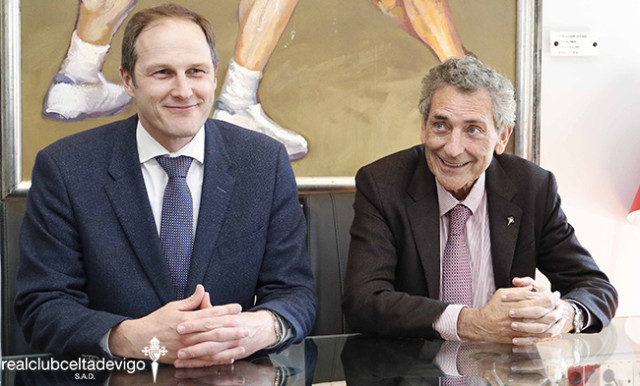 El presidente del RC celta, Carlos Mouriño, y el director de PSA Peugeot-Citroën en Vigo, Yann Martin, mantuvieron este lunes una reunión en la sede social celeste para cerrar un acuerdo que garantiza la continuidad de la relación entre ambas entidades y que pasa porque la empresa patrocine la Fundación Celta de Vigo.