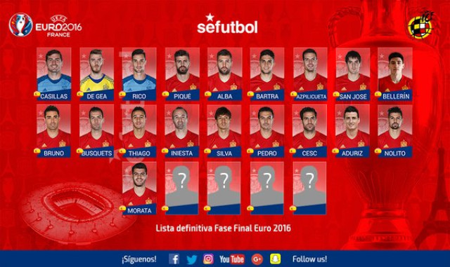 Quedan todavía cuatro componentes del equipo por confirmar, Vicente del Bosque deberá descartar dos jugadores de entre Saúl, Juanfran, Koke, Lucas Vázquez, Sergio Ramos e Isco.